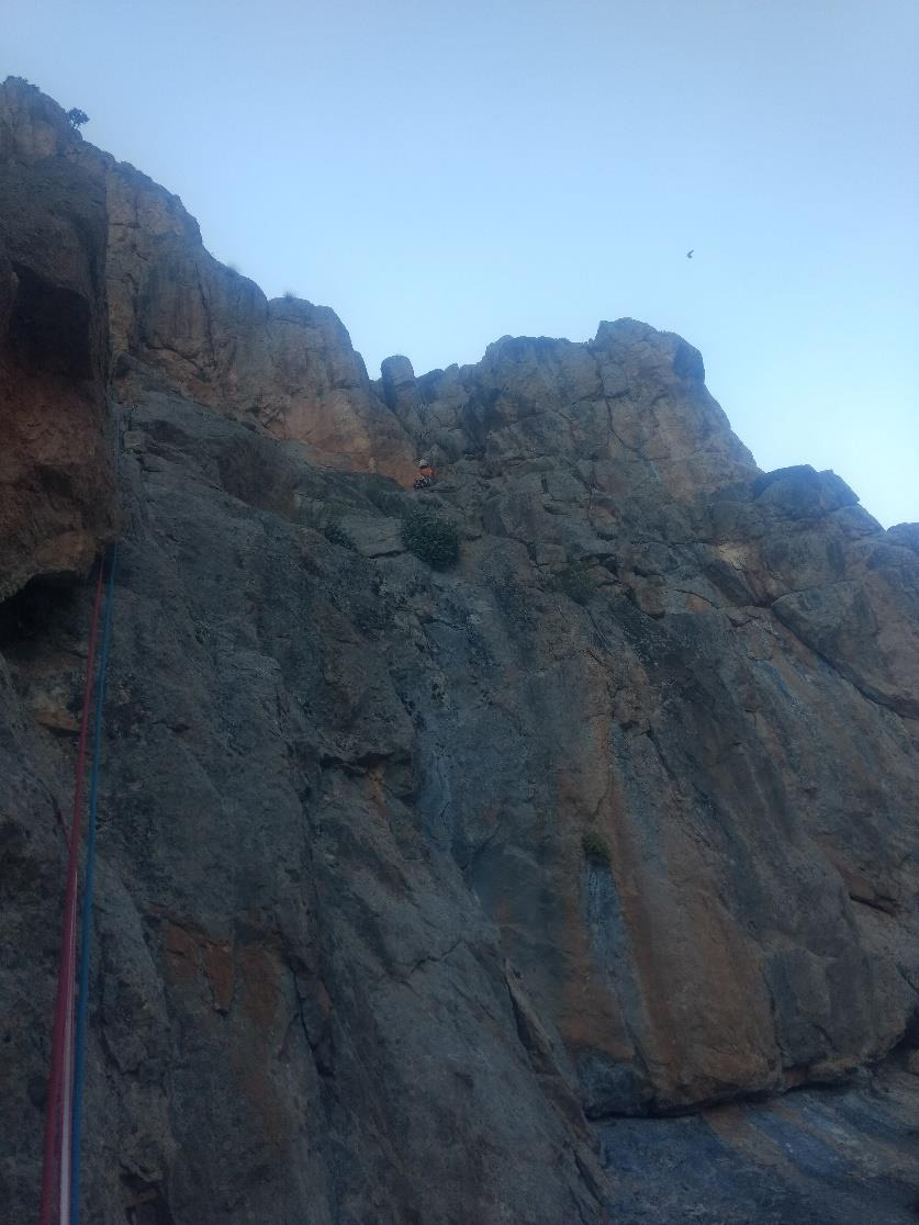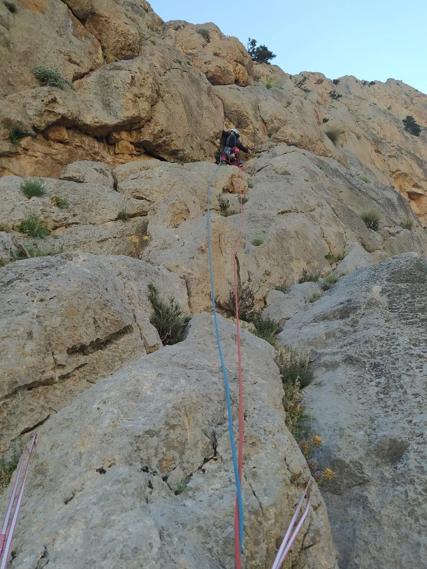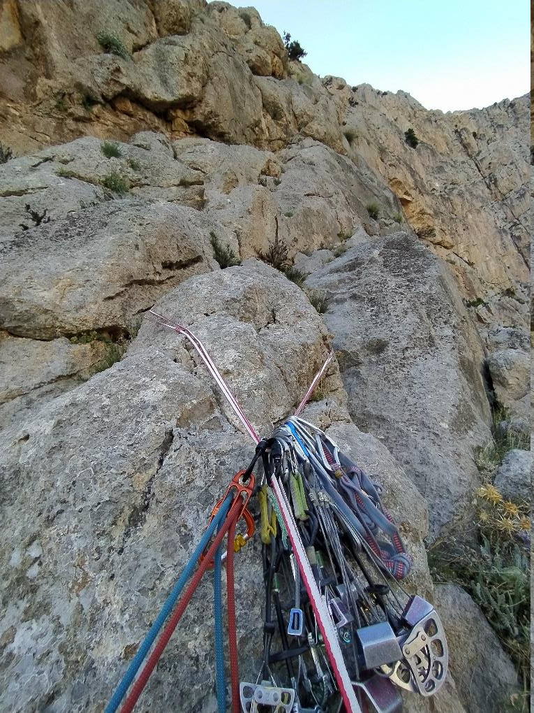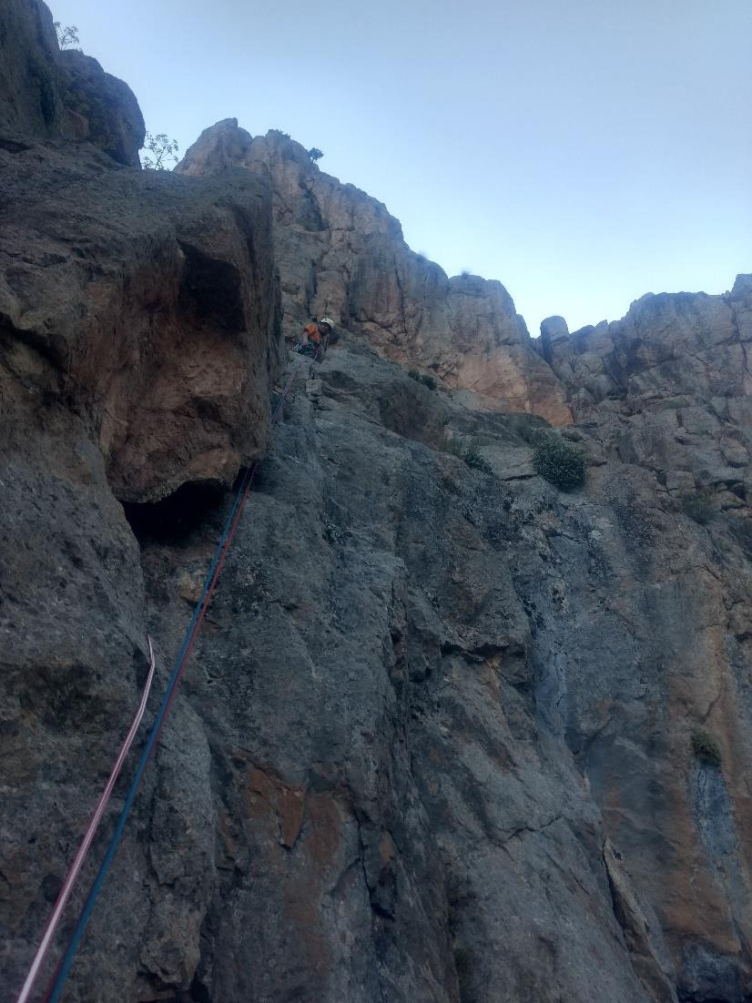 1.İp: (IV+) Mağaradan sağa geçince belirgin ayrık kayanın olduğu çatlaktan tırmanışa başladık. Yağız o çatlağı ayrık kayadan olduğu için çıkmak istemedi, onun yerinde biraz daha sağındaki emniyet atılamayan ama sağlam olan slablardan yükseldi (Foto4). Daha sonra yine sağa doğru yan geçiliyor ve set set ilerleyen kulvarımsi bir yapıdan yükseliniyor. (Foto5) Yağız burayı da çıkıp ipin bittiği yerde babadan istasyon kurdu.(Foto6)