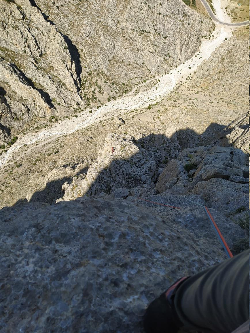4.İp: Yağız'ın ip sürtmesinden dolayı hepsini tırmanmadığı kulvar-çatlak etabını bitirdikten sonra büyük sete ulaştım. Bu setten biraz sola geçtikten sonra çıkması en makul gözüken kısa bacadan tırmanılıyor ve yine bir sete çıkılıyor. Burada büyük bir babadan istasyon alıp ipli kısımları bitirmiş olduk. Buradan sonra yaklaşık 30 metre daha ipte ilerledikten sonra zirveye yakın bir yerde ipten çıkıp ipi topladık. Biraz daha serbest yükselince zirve düzlüğüne vardık.