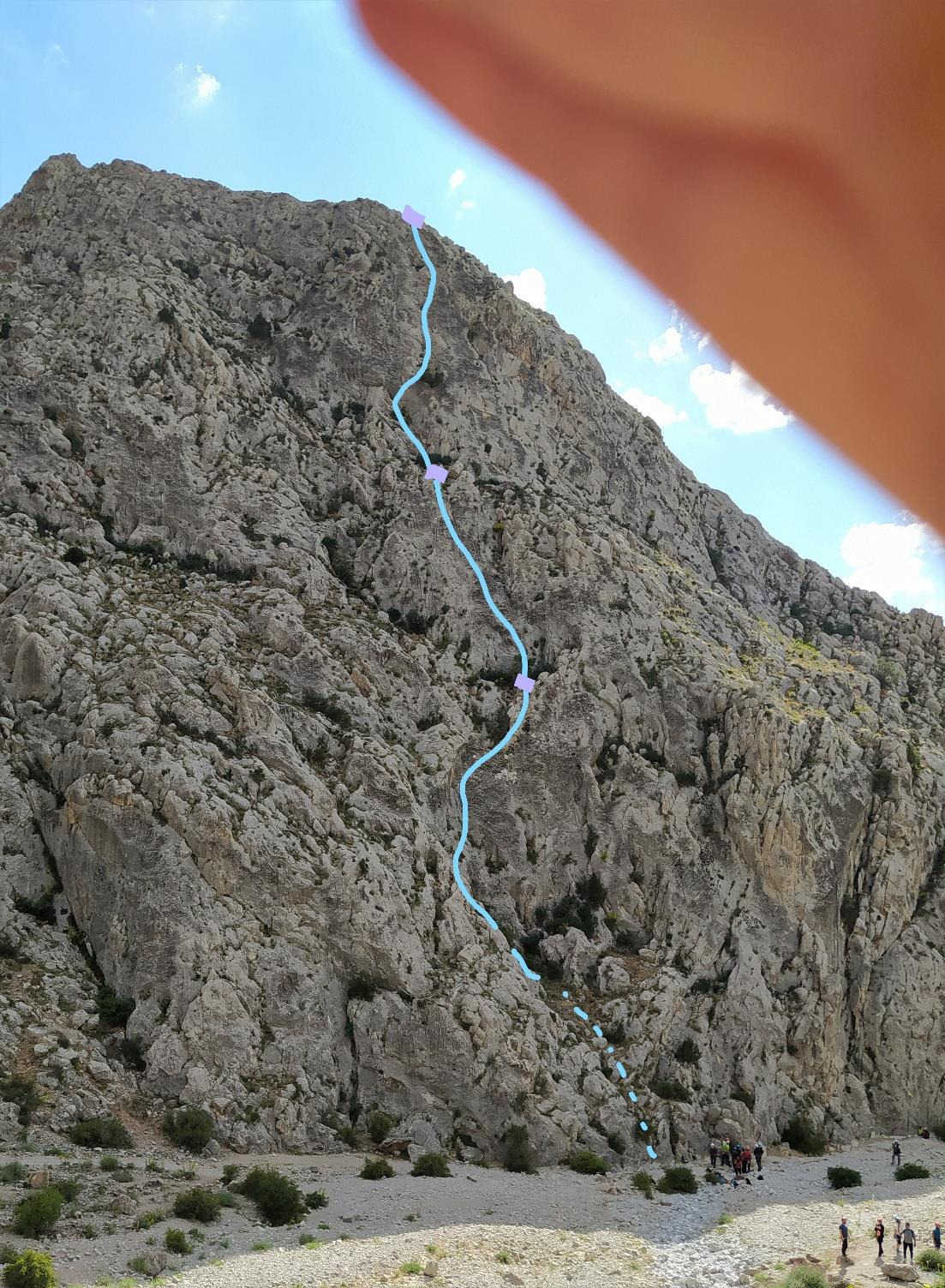 3.İp: (40 metre VI+) Kilit ip! Bu ip boyunda altı bolt ve bir kum saati mevcut. İkinci istasyonun olduğu yerden 5 metre sonra kilit etap başlıyor. Hafif negatif ve kısa bir kaç hamle gerektiren bu etabın başında bir kum saatinde önceden bırakılmış baba ipi mevcut. Biz rotaya girdiğimizde durumu iyiydi ve ara emniyet olarak kullanıldı. Kilit etap bittikten sonra da bir bolt gözüküyor. Burayı geçerken lider boltun sıcak kollarında güvenli bir şekilde hamlelerini yapabilir. Sonrasında boltlar sizi istasyona kadar götürecektir. İstasyona vardığımızda saat 8.10 idi.