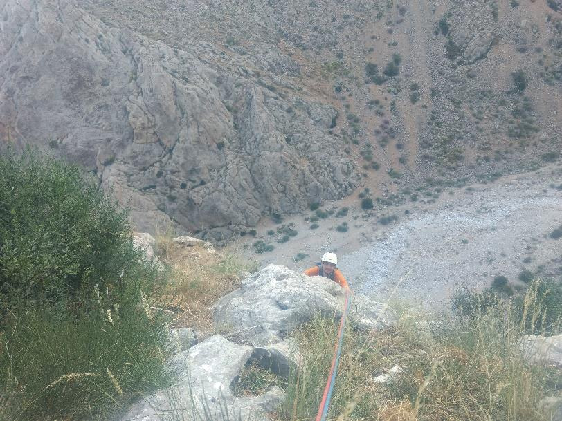 15 Temmuz saat 5.30 da uyandık ve kahvaltımızı yaptık. ORDOS Dağ Evinden yaklaşık 15 dklık bir yürüyüş ile rota dibine varılıyor. Rota Cimbar Vadi'sinin sağ tarafında Lavinya Sektörden hemen sonra yer alıyor. Rota dibine varıp hazırlanmaya başladığımızda saat 6.00 idi. 1.İp: (40 metre V-) Bu ip boyuna Cimbar Vadisi'nin tabanından başlamak yerine biraz daha yukarıdaki otlu setlerden başlamayı tercih ettik. Serbest olarak yükseldiğimiz bu etaplar rahattı. Otlu sete vardıktan sonra ipe girmek için hazırlıklara başladık. Bu ip boyu üzerinde beş bolt ve bir kum saatini ara emniyet olarak kullandık başka hiç bir malzeme atmaya gerek duymadık. İstasyona vardığımda saat 6.50 idi.